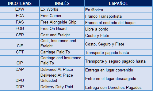 Los INCOTERMS son de términos comerciales de estándar internacional propuestos por la Cámara Internacional de Comercio (ICC) a través de la Comisión de Derecho y Práctica Mercantil (CLP), con sede en Paris, su primera publicación fue en 1936, con revisiones en 1953, 1967, 1976, 1980, 1990, 2000 y 2010, se actualizan cada 10 años. Se utilizan para establecer las obligaciones y responsabilidades entre el comprador y el vendedor.